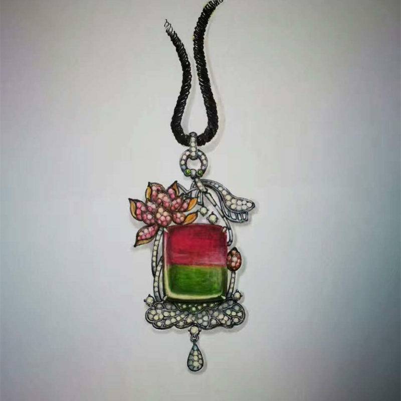 说明:主石为西瓜碧玺,副石为石榴石,钻石以及葡萄石。首饰灵感来源于莲花,荷叶的造型。