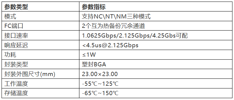 TFC1553A芯片是一款高性能、自主可控、完全国产化的ASIC芯片,实现了FC1~FC4功能。芯片内部集成了协议逻辑、接口控制和存储管理,可以配置为NC/NT/NM模式,对外提供2路FC网络接口、2路host数据接口和1路控制接口。该芯片功能强大,体积小巧,功耗低,非常适合于功耗、体积要求严苛的嵌入式系统,能够广泛应用于航空、航天等领域,以下是该芯片的技术指标: